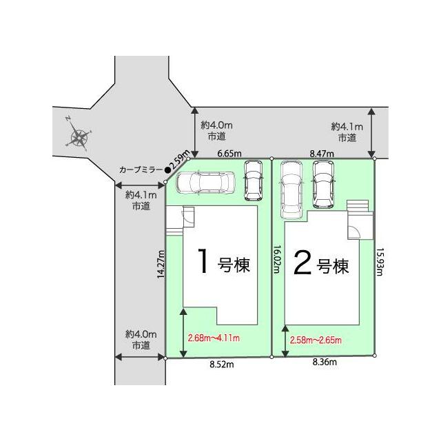 | 用途地域 | 1種低層 | 接道状況 | 北西4.0m 公道 接面14.2m 北東4.0m 公道 接面6.6m |